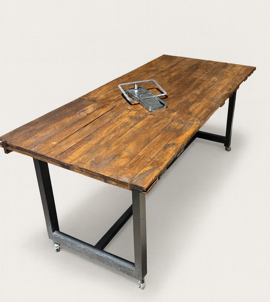 Una mesa de madera con visible desgaste y ruedas en las patas, con una sierra de mano sobre ella.