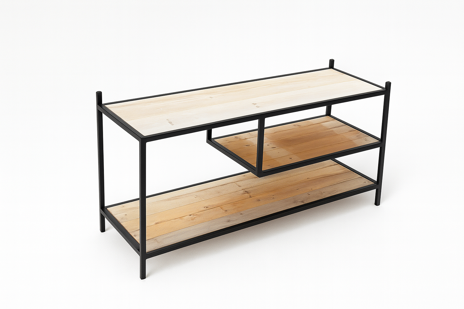 Estantería con marco negro y tablas de madera en diferentes tonos, formando un mueble moderna.